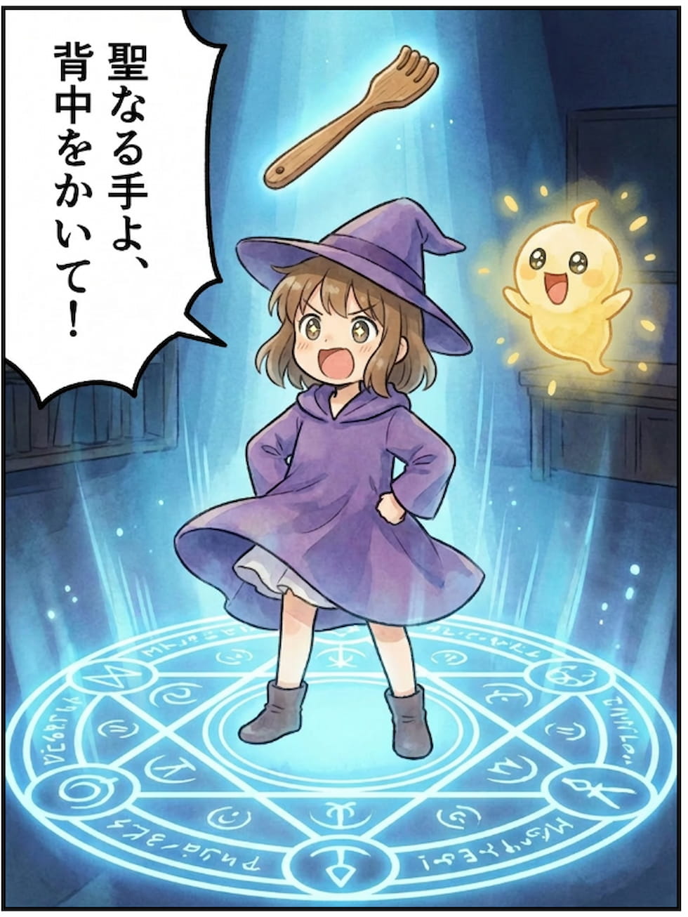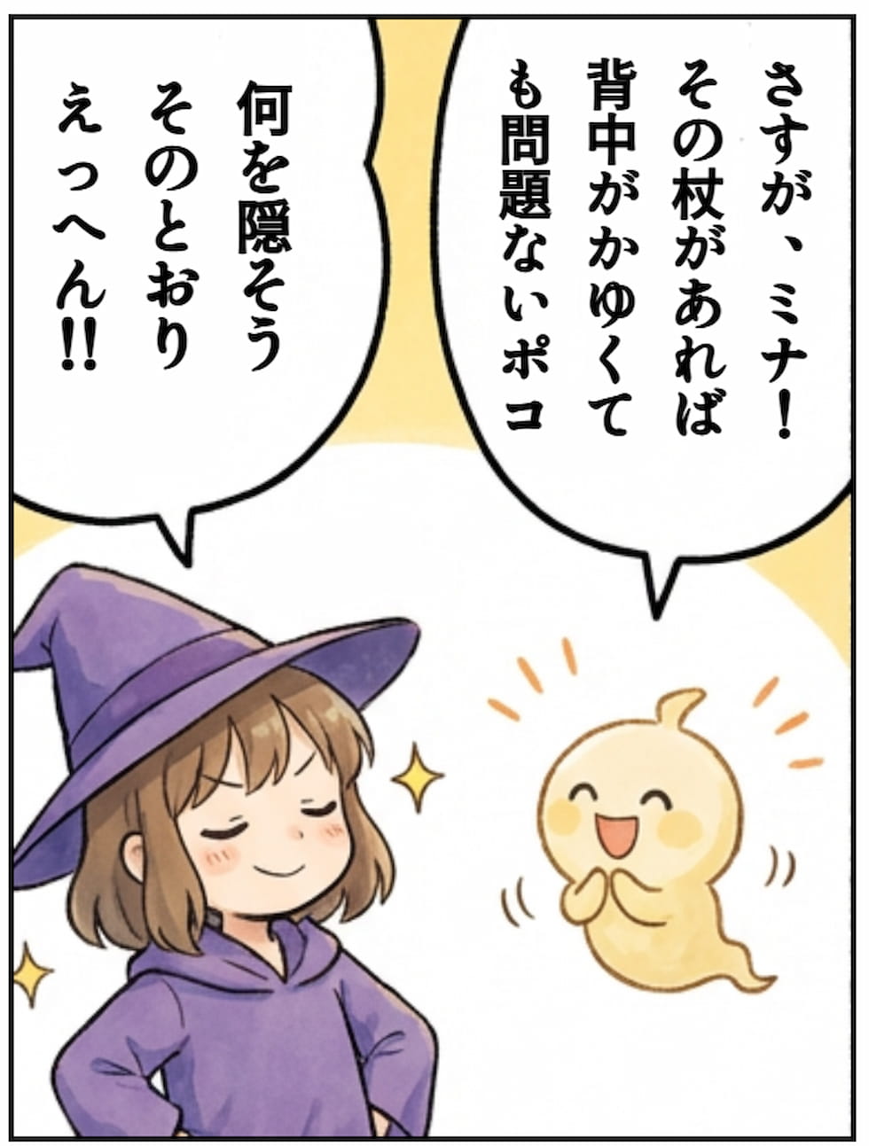 さすが、ミナ! その杖があれば 背中がかゆくても 問題ないポコ